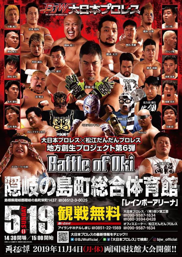 そこで、雲南市、大分県佐伯市に続き、今年もやります!大日本プロレス×松江だんだんプロレス地方創生プロジェクト第6弾!今回は「Battle of Oki」ということで、隠岐の島町で行います。